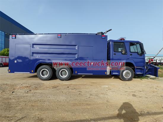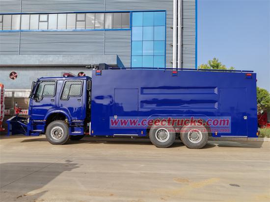 HOWO 6x4防爆放水車は、HOWO HW76複列キャブシャーシをベースに改造され、ホイールベースは4600+1350mm、WP10H400E60エンジンとHW15710ギアボックスを搭載しています。車両は防爆ボックス、上部に主砲、頭部に前部放水砲を装備し、全方位、大流量、長距離の暴動鎮圧を実現します。複列キャブ、6人乗り。給水タンク:12000L、泡タンク:100L、染料タンク:100L、胡椒水タンク:100Lを搭載。CB10/60消防ポンプを搭載。車両前部には暴動防止鋼板と強力な油圧式障害物除去鋼製シャベルを装備。ランプと窓ガラスはステンレスメッシュで保護されています。