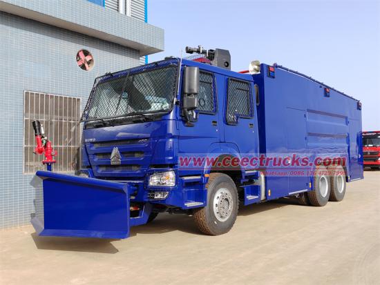 Emission medium: clean water, foam, pepper water, dyeこれHOWO装甲群衆制御暴動車HOWO HW76複列キャブシャーシをベースに、4600+1350mmのロングホイールベース、400馬力エンジン、10速ギアボックスを搭載。力強く、柔軟性も抜群です。12,000Lの浄水タンクと100Lの泡・催涙水・染料専用タンクを搭載し、浄水による暴動鎮圧、泡消火、染料マーキング、催涙水による制服への適用など、多機能な戦術切り替えを実現しています。上部に主砲、前方に補助砲を配置したデュアルウォーターキャノンシステムは、360°の射程範囲をサポートします。°85メートルの長距離射撃範囲を誇り、屋根と車体への高圧噴射と組み合わせることで、車体全体の暴動鎮圧と火災箇所の消火を効果的に行うことができます。車体は全面装甲保護とスムーズな登攀防止設計を採用し、PLCインテリジェント制御、油圧障害物除去、ビデオ監視、放送警報などのシステムを統合し、高強度の暴動鎮圧、消火、障害物除去のニーズに対応しています。都市の安定維持、森林火災の消火、対テロ攻撃など、さまざまなシナリオに適しています。これは、次世代の効率的な暴動鎮圧兵器です。