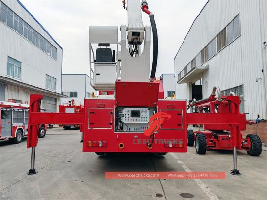 Howo高揚力消防車は、中国のHowo重型シャーシを改造したもので、強力なパワーと先進的な構成を備えています。パワーテイクオフはオリジナルのシャーシパワーテイクオフで、最も優れたパワーマッチングを備えています。サブフレームは、ねじれ抵抗に優れた大断面箱型構造を採用し、アウトリガーは短スパンH型構造を採用し、アームは折りたたみ式アームの組み合わせを採用し、迅速かつスムーズに動きます。旋回部には、360度無制限の旋回角度を実現できる中央旋回ジョイントが装備されています。Howo高揚力消防車には、大流量消防ポンプと火災監視装置が搭載されており、貯水槽と水路はすべて高品質のステンレス鋼と高強度アルミニウム合金管で作られています。油圧システムは、高性能ポンプと電液比例制御モードを採用しています。電気システムは、成熟した信頼性の高いコントローラCANバス通信技術と、多点集中操作を採用しています。車体は防錆アルミ合金スキン構造を採用し、装備箱は大容量のローリングドア構造を採用しています。HOWOハイリフト消防車は充実した支援設備を備え、自前の貯水槽、消火栓、池などから手軽に給水でき、中継給水も可能です。排水口と注水口は車体の左右に対称に配置されており、様々な現場の要求に完全に応えます。