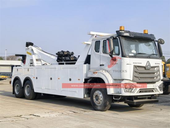 With two 10tons hydraulic winchesこの heavy duty wrecker , built by CEEC Trucks Group, utilizes the Howo NX cabin 6 x 4 drive chassis is equipped with a powerful WP10.340E22 diesel engine,3 4 0 HP /1250N . m of torque,HW1 9710 10 -speed transmission. Combined with an 9 ton front axle and 16 ton rear axle, it ensures exceptional power, load-bearing capacity, and reliability. It incorporates two 1 2 ton s hydraulic winches, resulting in an impressive rated towing capacity of 18 tons, making it ideal for handling accidents involving large trucks, buses, and construction machinery.