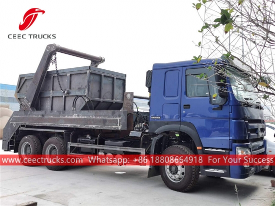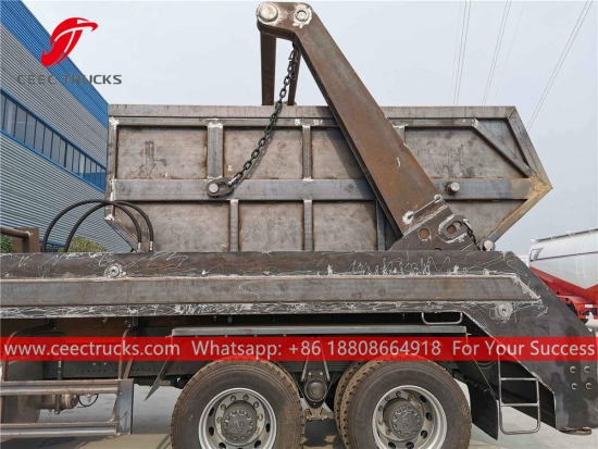 HOWOスキップローダー廃棄物収集トラック、6x4右ハンドルシャーシ、9速マニュアルギアボックス、SINOTRUK製290馬力ディーゼルエンジン、高強度鋼製スイングアームシステム、油圧制御装置、電気制御ボックス(オプション)。塗装とロゴはご要望に応じて変更いたします。