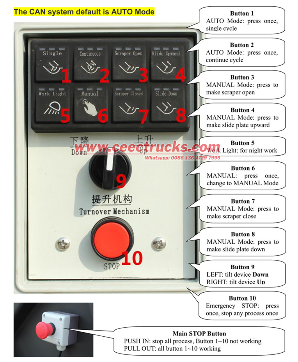7. 積載・荷降ろし作業は自動で完了するため、許可なく調整することはできません。PTOの回転速度が高すぎるとPTOまたは燃料ポンプ動力装置が損傷し、回転速度が低すぎると作業効率が低下します。