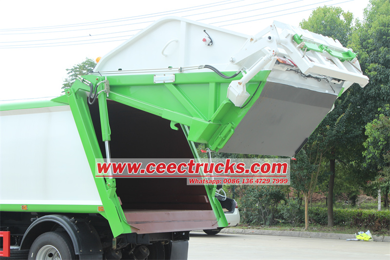 Rear loader hopper for 240L and 1100L binsいすゞ廃棄物圧縮車日本のISUZU NPRトラックのシャシーを改造し、T420高強度特殊鋼製の圧縮機ボディを採用。側面4mm、床面4mmの厚みで、軽量ながらも強度に優れています。また、密閉設計により、圧縮、積載、輸送の過程でゴミが密閉された状態を保ち、二次汚染や悪臭の発生を効果的に防止します。圧縮比は2.5を超え、同じコンパートメント容積でより多くのゴミを収容できるため、輸送効率が大幅に向上します。リアゲート容量は0.8立方メートル以上で、急速排出システムと組み合わせることで排出時間は45秒以内となり、ゴミ処理サイクルを大幅に短縮します。操作面では、いすゞ NPR リアローダーコンパクタートラック手動モードと自動モードの両方のギアボックスをサポートし、さまざまな操作シナリオに対応し、操作の柔軟性と利便性を向上させます。
