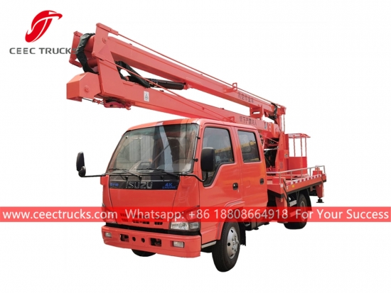 18mバケットクレーン付きトラック、ISUZU 600P LHD 4x2シャーシ、MSB 5速マニュアルギアボックス、ISUZU 120HPディーゼルエンジン。塗装とロゴはご要望に応じて変更いたします。お客様の言語に対応したコントロールボックスをご用意しております。