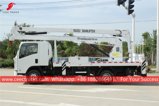 18mバケットクレーン付きトラック、ISUZU 700P LHD 4x2シャーシ、MLD 6速マニュアルギアボックス、ISUZU 190HPディーゼルエンジン。塗装とロゴはご要望に応じて変更いたします。お客様の言語に対応したコントロールボックスをご用意しております。