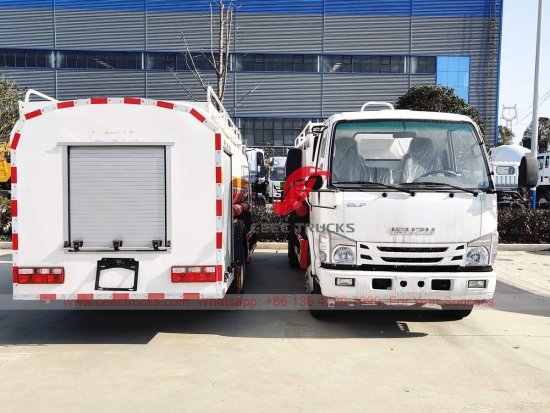 ISUZU 4,000L 消防水車、ISUZU 4×2 左ハンドルシャーシ、MSB 5速マニュアルギアボックス、ISUZU 98馬力ディーゼルエンジン、有名ブランドの消防ポンプ、オプションでフロント、ミドル、リア散水ノズルを装備可能。塗装とロゴはご要望に応じて変更いたします。