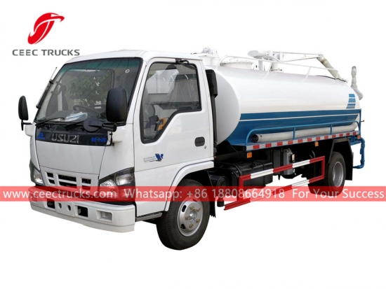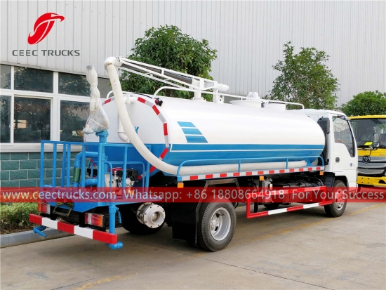 ISUZU 5,000リットル汚水溜め排出トラック、ISUZU 4x2 左ハンドル シャーシ、MSB 5 シフト マニュアル ギアボックス、ISUZU 130 HP ディーゼル エンジン、強力吸引タンカー、有名ブランドの真空ポンプ、すべての塗装とロゴは要件によって異なります。