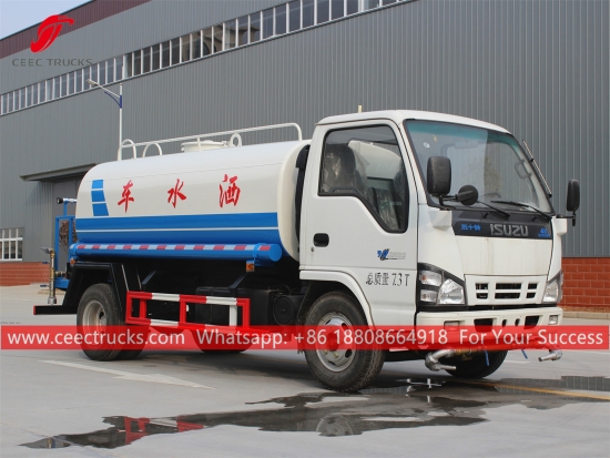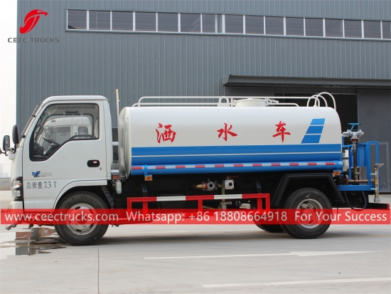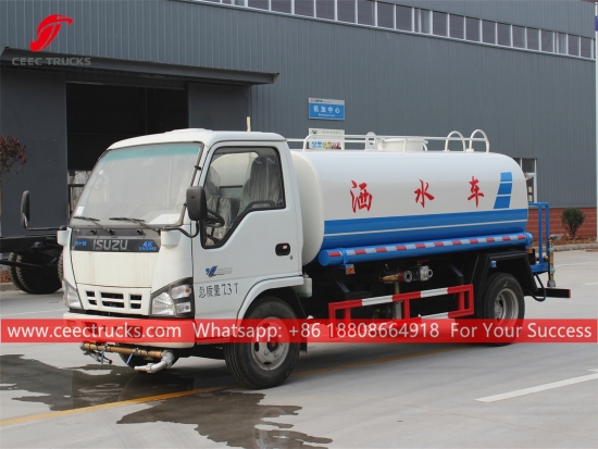 ISUZU 5,000L 給水車、ISUZU 600P 左ハンドルシャーシ、MSB 5速マニュアルギアボックス、ISUZU 130馬力ディーゼルエンジン、有名ブランドのウォーターポンプ、オプションでフロント、ミドル、リアの散水ノズルもご用意しております。塗装とロゴはご要望に応じて変更いたします。