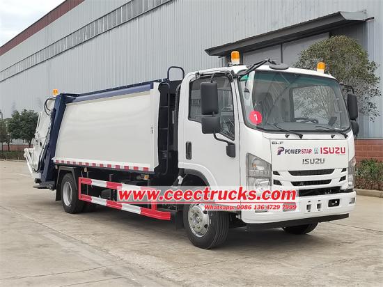 Isuzu rear loader truck with a flip mechanismいすゞ 700P ダンプスターコンパクタートラック、Isuzu NPR 700P シャーシを改造し、ホイールベース 4175 mm、エアコン、USB、方向指示器、4HK1-TCG61 エンジン、5193 ml EURO 6 排出ガス、Isuzu MLD 6 速ギアボックスを備えています。この車両には 10 cbm の炭素鋼製ゴミ箱、4 つの側面と 5 つの底部の厚さ、中国トップ ブランドの油圧シリンダーを備えた弧状の圧縮機本体が装備されています。尾部は反転できるフリップ機構で、240 L、360 L、660 L、770 L のゴミ箱を掛けることができます。CAN-BUS 電気制御システムで簡単に操作できます。