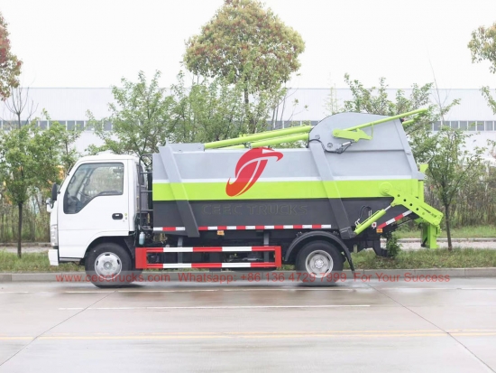 ISUZU 7cbmノンリークゴミ圧縮車。シャーシにはISUZU 98馬力ディーゼルエンジンとMSB 5速トランスミッションを搭載。圧縮車体は船型構造とCAN制御システムを採用し、操作性も向上。塗装とロゴはすべてお客様のご要望に応じて変更いたします。