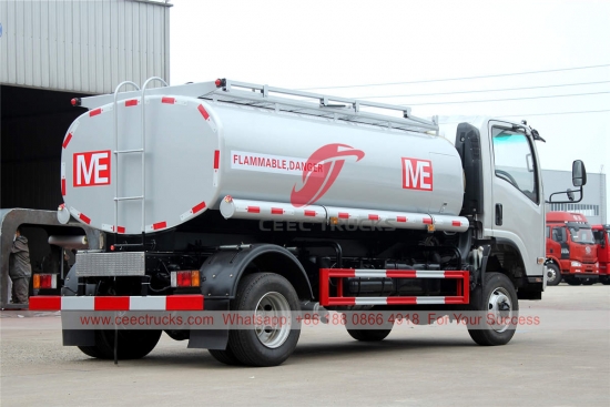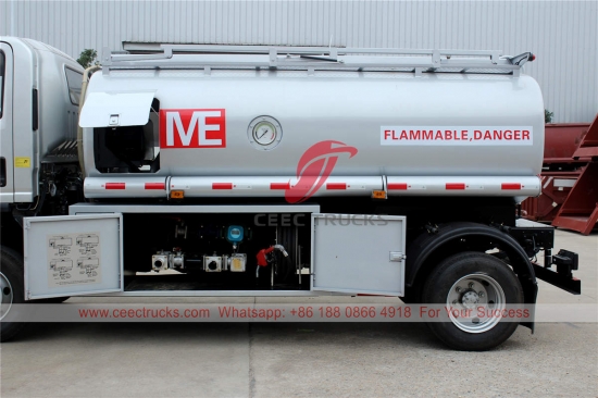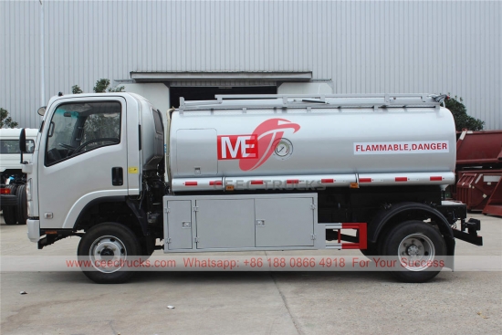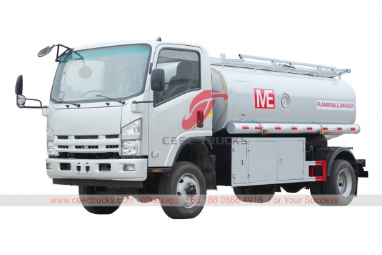 ISUZU 8,000リットル給油トラック、カスタマイズされたISUZU 4×4シャーシ、MLD 6速マニュアルギアボックス、ISUZU 190馬力ディーゼルエンジン、標準装備の燃料タンク、有名ブランドのオイルポンプ。塗装とロゴはご要望に応じて変更いたします。