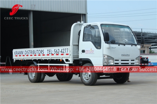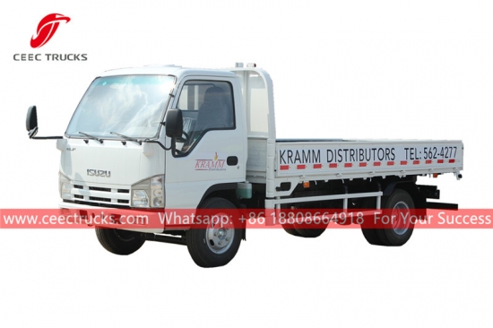 ISUZU フラットボディ トラック、ISUZU ELF 4x2 シャーシ、MSB 5 シフト マニュアル ギアボックス、ISUZU 98HP ディーゼル エンジン、塗装およびロゴは要件によって異なります。