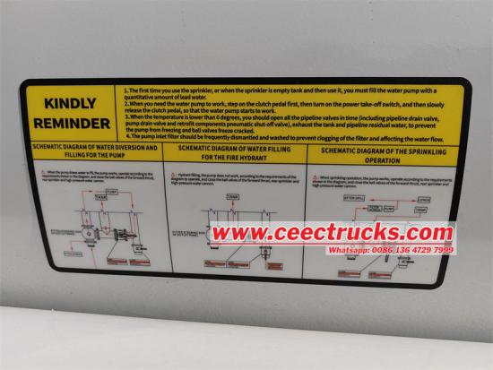 フロントスプレー、車両後部には作業プラットフォームがあり、高圧洗浄機と高圧水銃が装備されており、ニーズに応じて調整できます。また、高品質のスプリンクラーポンプが装備されており、火災インターフェースとオーバーフローバルブが装備されており、自己プライミング機能があります。 |