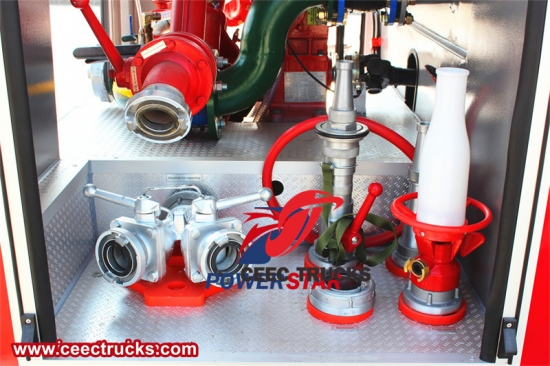 この消防車のコントロールパネルはシンプルで実用的であり、圧力計、真空計、水圧計、タコメーターなどの主要な計器を備えています。圧力計はシステム内の圧力を表示し、真空計は吸引状態を監視してシステムの正常な動作を確保します。水圧計はウォーターポンプシステムの水圧を正確に表示し、消防士にとって重要な参考情報を提供します。タコメーターはエンジン回転数を監視し、消防士がエンジンの動作状態を把握するのに役立ちます。