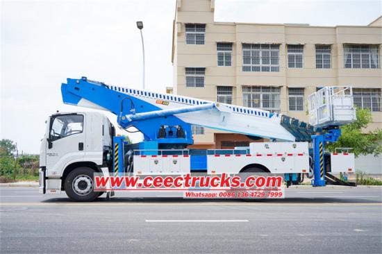 ISUZU FTR 45mバケットリフトは、ISUZU FTRシャーシをベースにした高所作業車です。ISUZU GIGA 4X VC61キャビンを搭載し、オペレーターに広々とした快適な作業環境を提供します。同期伸縮技術を採用した7段16角伸縮ブームを採用し、迅速かつ容易な操作と広い作業範囲を実現します。さらに、前方V字型と後方V字型の3段アウトリガー設計により、様々な複雑な地形でも安定した作業を実現します。作業台は後方に配置され、アクセスが容易です。ステンレス製バスケットは200kgの積載能力を備え、多様な高所作業ニーズに対応します。