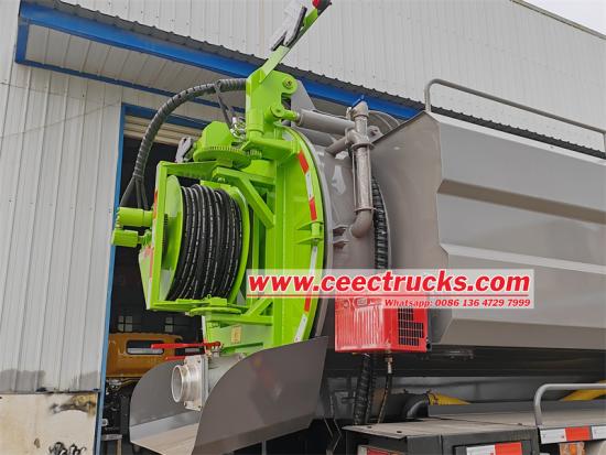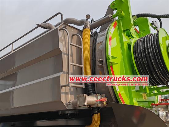 複合タンクの後端にはホースリールが装備されており、付属の下水ジェッティングホース(直径1インチ)を最大120メートルまで収納できます。ジェッティングホースの出し入れは、低速・高トルクの油圧システムによって行われます。 |