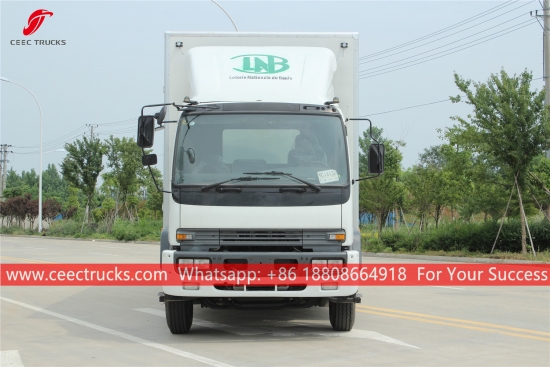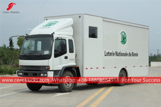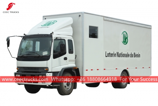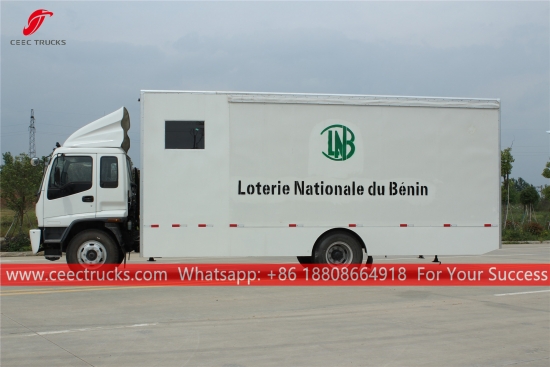 ISUZU 移動ステージ ショー トラック、ISUZU FTR シャーシ、MLD 6 シフト マニュアル ギアボックス、ISUZU 205HP ディーゼル エンジン、バン ボディ寸法はオプション、塗装およびロゴは要件によって異なります。