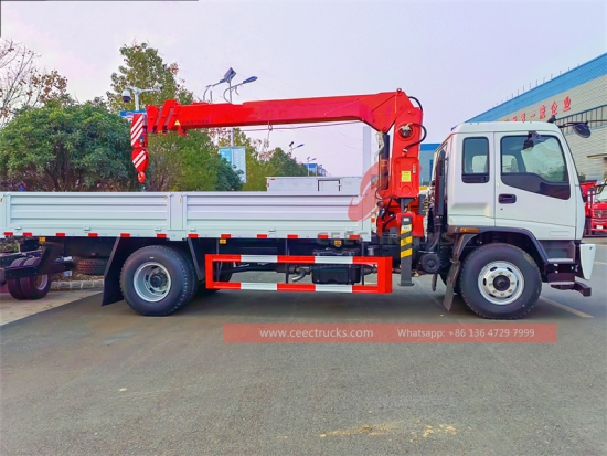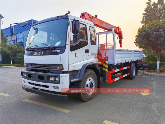 ISUZU FTR 5トンブームクレーントラック、ISUZU FTR 4×2 左ハンドルシャーシ、6シフトマニュアルギアボックス、ISUZU 205HPディーゼルエンジン、中国の有名ブランド5トンブーム伸縮クレーン、貨物本体寸法は要求どおり、塗装およびロゴは要件によって異なります。
