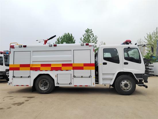 ISUZU消防車は、Isuzu消防車、Isuzu消防車、Isuzu消防車テンダーとも呼ばれています。ISUZU FVRトラックシャーシQL1180XMFRY、エンジンモデル6HK1-TCLモデル、300HP、シャーシホイールベース4500に基づいて構築され、オリジナルのシングルキャビンにハーフスリーパーを改造して、フロントオリジナルの2つの座席とリア4つのSCBAシートを備えたダブルクルーキャビンにし、空気装置収納に適しており、カスタマイズされたダブルキャビンは2時間以上の降雨テストに合格しました。オリジナルのインストールされたサンドイッチPTOは駆動軸に接続し、後部に取り付けられた消火ポンプに接続します。後部ポンプモデルはXIONGZHEN CB10 / 40、流量は10 barで40L / s、上部にWESTER PL8 / 32火災モニターが搭載され、WESTERブランドの消防ホースリールも搭載され、作業長は30mで手動操作タイプです。前部はアルミ合金製の収納ボックス、後部はアルミ合金板で装飾されており、様々な消防救助用具の収納と使用に適しています。いすゞ消防タンクローリーのキャビン上部には、サイレンと拡声器付きLEDピローライトが取り付けられています。