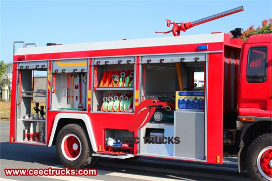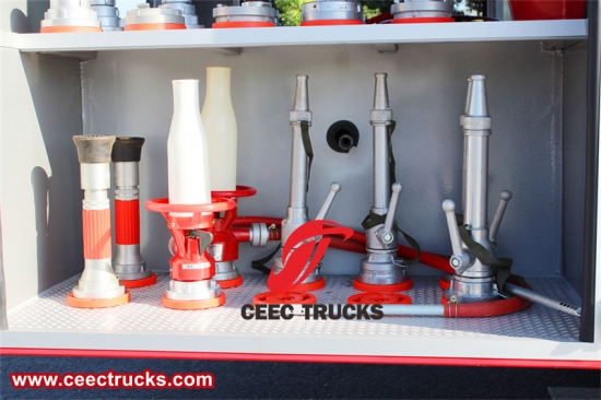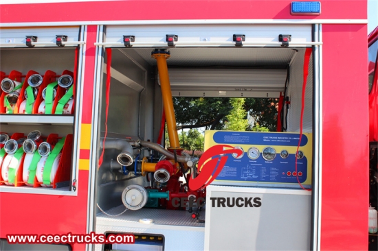 前面、側面、スプリンクラーを装備(散水幅>14m) 消火ポンプポンプ搭載(吸上リフト>7メートル) 消火弁、水弁、フィルターガーゼを装備。 放水砲を装備。 タンカーとシャーシ間のゴムパッド ウォーターポンプを装備 消防隊システムを搭載し、上部に火砲を装備 |