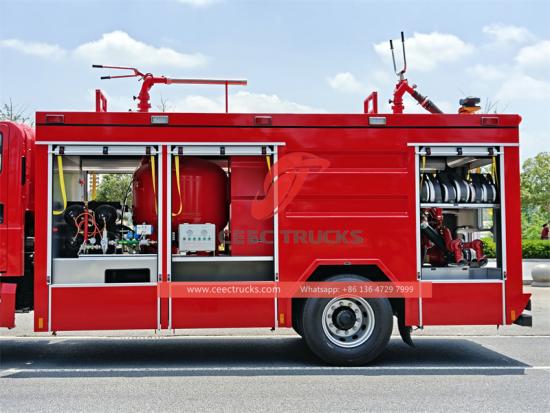 Customized dry chemical system with Nitrogen tankerいすゞ新型ギガFTRシャーシをベースにした乾燥粉末消防車です。強力ないすゞ4HK1-TCエンジンを搭載しています。 G 60エンジンは排気量5.19L、出力205馬力で、4X2の駆動モードを採用し、MLD-6速ギアボックスを備えています。最高速度は95km/hに達し、さまざまな複雑な道路状況に適応できます。消防システムに関しては、いすゞ消防車は1000kgの炭素鋼乾燥粉末貯蔵タンク、3000Lの水タンク、2000Lの泡タンクを備えています。設計圧力15MPaの80リットル窒素ボンベ4本が乾燥粉末消火システムを補助しています。消防ポンプはPTO駆動で、圧力範囲は1.6~2.5MPa、流量は80~120kg/sです。消防砲の噴射速度は60~100kg/s、射程距離は40~60メートルで、さまざまな火災状況に効果的に対応できます。いすゞGIGA消防車には、ショベル、バール、斧、切断器具などの標準的な消防救助機器一式が装備されており、オプションではしごや投光器も装備できます。