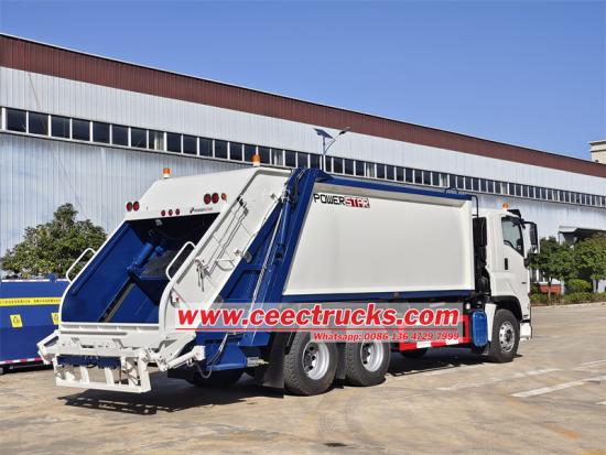 Isuzu VC61 6x4 cabin,large capacity garbage binいすゞギガ 6UZ1 エンジン リアローダー リサイクルトラック都市ゴミ処理の効率化を目的に設計された大型輸送車両である6x4圧縮ゴミ収集車は、油圧シリンダーを駆動する高度な圧縮システムを採用し、廃棄物を効率的に圧縮することで積載容量を最大限に高めます。キャビン内の電動操作やテールゲートの手動/電動切り替えなど、多彩な操作性を備え、オペレーターに柔軟性と使いやすさを提供します。