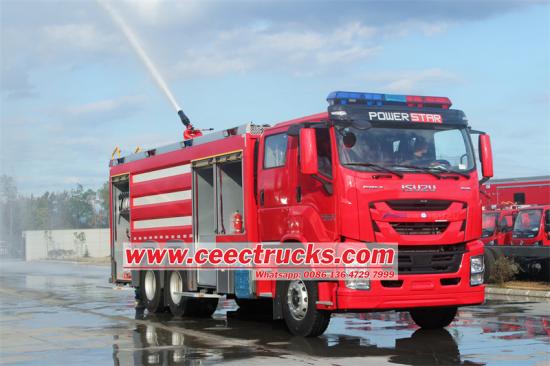 このISUZU GIGA消防車は、実戦を想定して設計されています。2列キャビンは5人乗りで、後列には空気呼吸器ブラケットも装備されており、消防隊員が火災現場への進入準備を整えることができます。PLC制御の消火システムは、柔軟で多様な操作オプションを提供します。ルーフに搭載された遠隔操作式消火器は360度回転し、消火活動の柔軟性と効率性を高めます。LED照明システムと警告灯は、夜間の活動の安全性を確保します。総合的に見て、このISUZU GIGA消防車は、現代の消防車の最高レベルを体現しています。