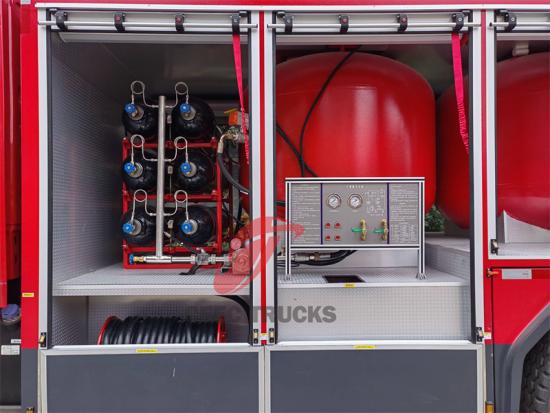 4000L dry powder tankいすゞGIGA粉末/窒素消防車は、効率的で用途の広い消火設備であり、重要な場所の火災で重要な役割を果たしています。粉末/窒素タンクを備えたいすゞGIGA 6x4消防車は、粉末と窒素の2つの消火媒体を組み合わせており、その消火原理は非常に包括的です。粉末は高温で溶融し、燃焼物の表面を覆う薄い膜を形成し、酸素を遮断して燃焼を抑制します。重炭酸ナトリウムなどの一部の粉末は高温で分解し、フリーラジカルを放出して燃焼の連鎖反応を妨げます。窒素は不活性ガスとして、空気中の酸素濃度を希釈して窒息と消火の目的を達成できます。さらに、窒素と粉末は噴霧時に熱を吸収し、燃焼物の温度を下げ、冷却の役割を果たします。