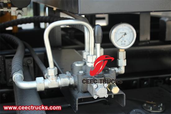 5. 便利な操作: 乗降操作には独立した制御弁を使用し、回転弁で油路を選択します。乗降連動により、降車時の誤操作リスクを効果的に低減します。乗降操作席はターンテーブル側面に配置され、ターンテーブルとともに無段階に回転するため、操作視野が向上します。また、立ったままクレーンを操作することができ、操作手順は簡単で便利であり、操作中に荷箱内の状況を直接確認できます。