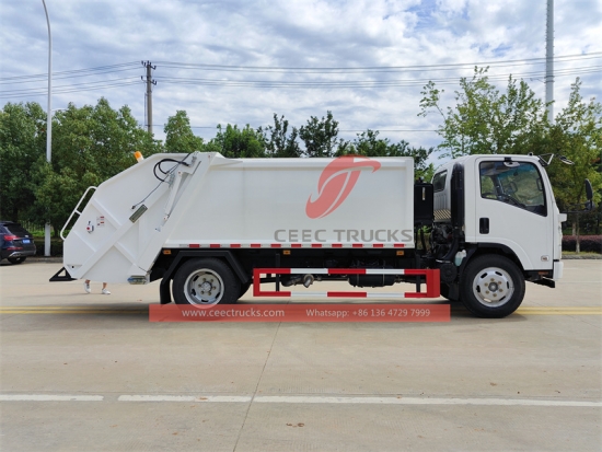 ISUZU 8cbmゴミ圧縮車。シャーシにはISUZU 190馬力ディーゼルエンジンとMLD 6速トランスミッションを搭載。PLC制御ボックスで操作も簡単。塗装とロゴはすべてお客様のご要望に応じて変更いたします。