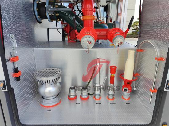 2. 水タンクからの給水: 車両に搭載された10立方メートルの水タンクは、消火システムに十分な水を供給します。消防ポンプは水タンクからパイプラインを通して水を汲み上げ、火災監視装置または泡消火ガンに加圧します。
