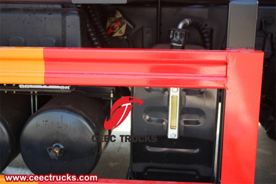 トラック後部には、ハイドロジェッティングシステムとその補助機器が収納されています。高圧ポンプと水タンクはシャーシにしっかりと固定されており、メンテナンスや水補充のためのアクセスポイントも容易に確保されています。水タンクは通常数百ガロンの水を収容できる容量で、頻繁な水補充を必要とせず、長時間の清掃作業を可能にします。