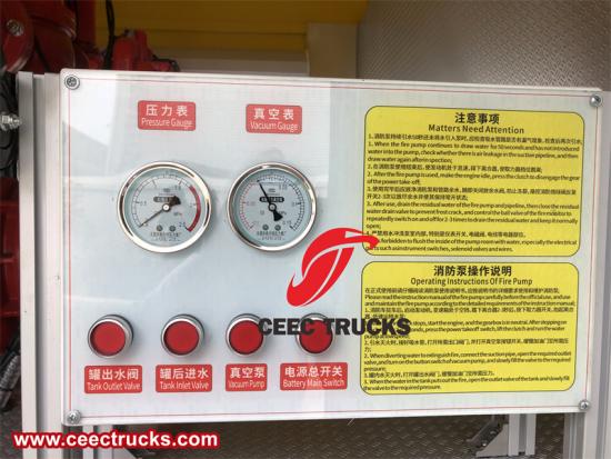消防ポンプには、圧力計と真空計、タンク出口バルブ、タンク後部給水口、真空ポンプ、主電源スイッチなどの操作ボタン、そして消防ポンプの操作手順と注意事項を備えた制御盤が接続されています。これらの操作盤には、様々な機能と機器が統合されており、消防士が様々な火災発生時に迅速に対応し、行動するための実用的で直感的なツールセットを提供しています。