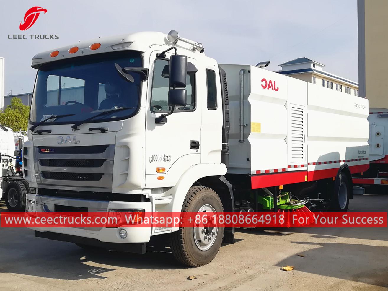 JAC製路面清掃・洗浄トラック。JAC LHD 4x2シャーシ、FAST 6速マニュアルギアボックス、FAW製182馬力ディーゼルエンジン、ステンレス製ダストビンと浄水器、4ブラシシステム、キャビン電動操作による快適な操作性。塗装とロゴはすべて新品です。要件に応じて異なります。