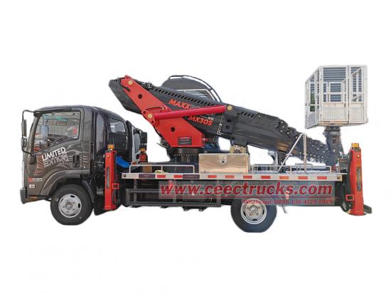 いすゞKV100 30m高所作業車は、いすゞKV100シャーシをベースに改造され、ホイールベースは3815mm、総重量は8280kg、いすゞ4KH1CN6HB 132HPユーロVIエンジン、いすゞMLD 6速ギアボックスを搭載し、上部は8段18面同期伸縮アーム、最大揚高は30メートル、最大作業半径は12メートル、車両全体に4つの油圧伸縮脚(上下伸縮と水平伸縮)と合計8つのシリンダーが装備され、前部X型、後部H型、個別調整可能、緊急ポンプ、360度回転作業プラットフォーム、アルミ合金フェンス、パターン滑り止め通路、バケット定格荷重200KG、ターンテーブルキャブで操作可能、地上制御ボックス、 ワイヤレスリモコン。