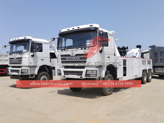 Shacman F3000 20トン道路レッカートラック、Shacman 6x4 クラシック LHD シャーシ、FAST 12 シフトギアボックス、Shacman 340HP ディーゼルエンジン、油圧シリンダー作動のリフティングブーム、塗装およびロゴは要件によって異なります。