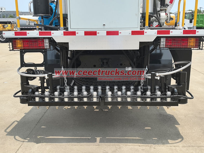 Shacman X3000アスファルト分配タンクローリーの後部には、幅調整可能な伸縮式散布ロッドが装備されており、複数の高精度流量制御ノズルが装備されています。透水性層、接着層、シーリング層などの施工要件に応じて散布量と散布範囲を正確に調整し、0.2~3L/㎡の広範囲可変散布を実現します。