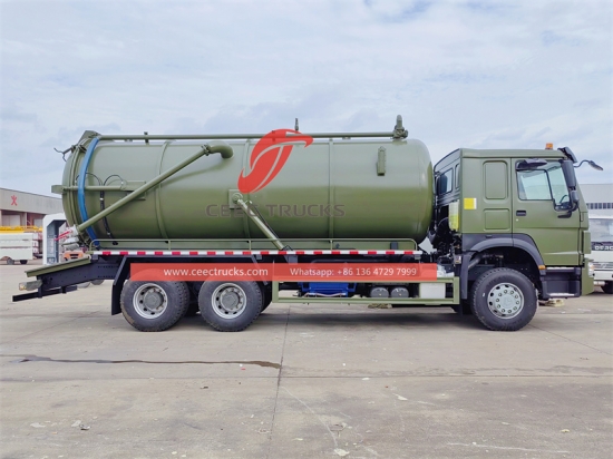 HOWO 6×4 バキュームタンクローリー (真空下水車、下水管吸引車、HOWO 下水車、排水溝清掃車、浄化槽清掃車、浄化槽清掃車とも呼ばれます) 汚水、汚泥、浄化槽、原油などの液体、そして小石やレンガなどの固形物の収集、輸送、排出に使用されます。下水道、汚水溜め、汚水槽、溝などの清掃に適しています。環境衛生分野で広く使用されています。