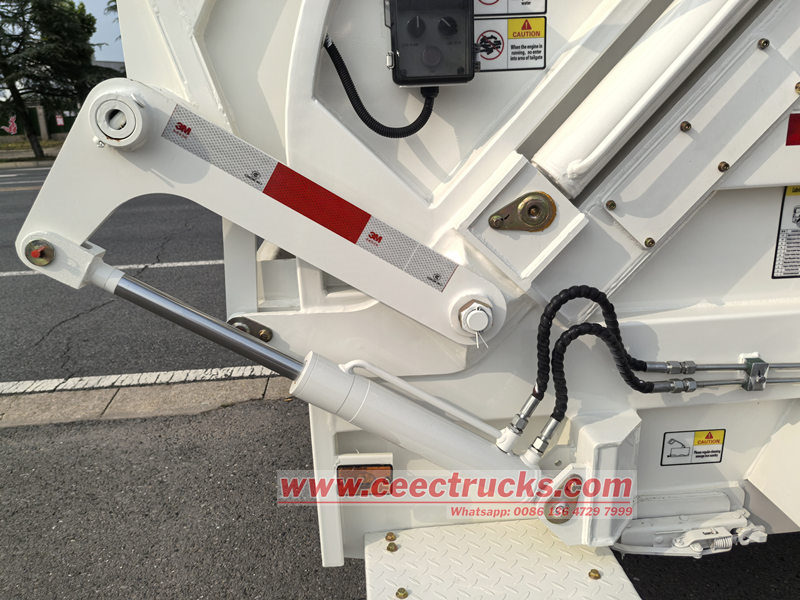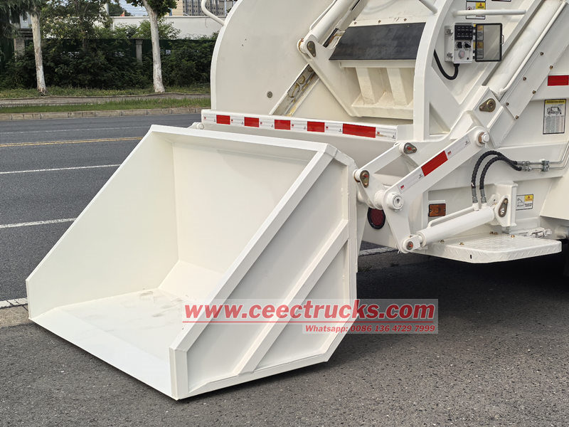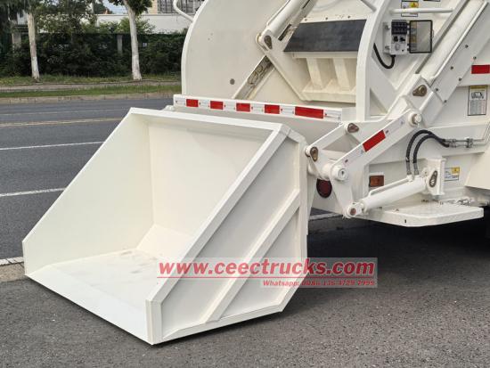 ● HOWOリアローダーゴミ収集車のゴミ箱とローダーは、高品質の炭素鋼板溶接構造を採用しており、ゴミ箱は円弧状断面を採用しています。ゴミ箱には折りたたみ式のシャベルが装備されており、シャベルシリンダーによって駆動され、ゴミ箱底の両側にあるガイドレールに沿ってスライドします。シャベルはゴミを降ろすだけでなく、ゴミ箱の前端を閉じる役割も果たします。