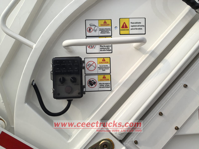 操作制御ボックスはキャブ内と車両後部に設置されています。キャブ内の操作制御ボックスでは、押し出しと積み下ろしの制御や操作モード(自動、手動など)の選択が可能で、車両後部の操作制御ボックスでは、押し込み・充填機構とバレル回転機構の動作を制御します。操作性が非常に高く、特に埋立地では、作業員は車両から降りることなく、積み下ろしと汚水排出を完了できます。また、ユーザーの要件に応じて、有線リモコン装置を設置することもできます。